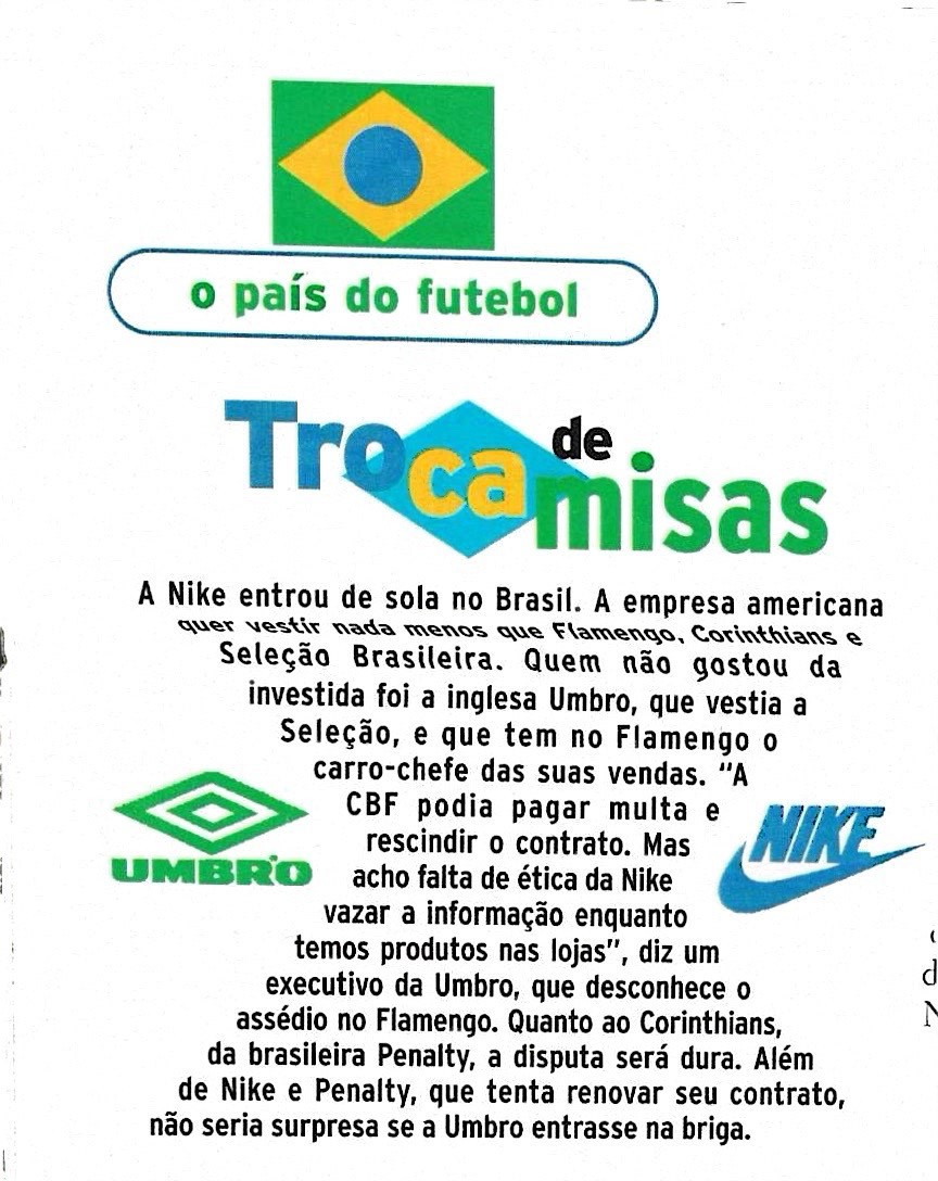Um dos trechos coletados favoritos da minha parte, um espaço dedicado para quando a seleção trocou o patrocínio da Umbro pela Nike, ainda nova no mercado e apostando forte na maior seleção do mundo, em Ronaldo Nazário e Michael Jordan.