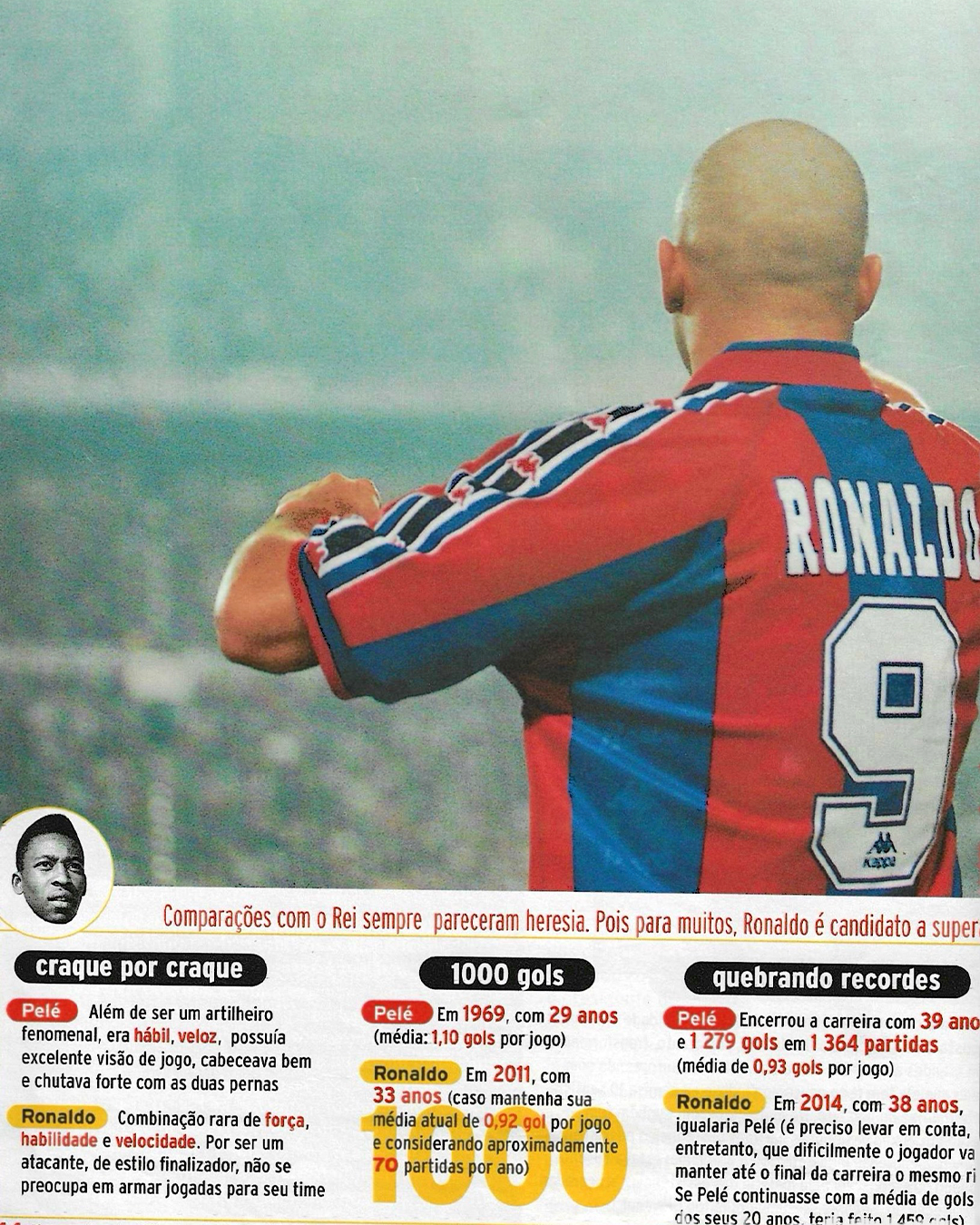 Para finalizar, ainda um recorte ainda de 96 quando Ronaldo foi melhor do mundo, uma comparação do craque com nada mais nada menos que Pelé. Por mais que seja dito como a comparação com Rei seja uma heresia, à época já existia a noção da grandiosidade do maior 9 que esse país já viu, melhor do mundo com apenas 18 anos.