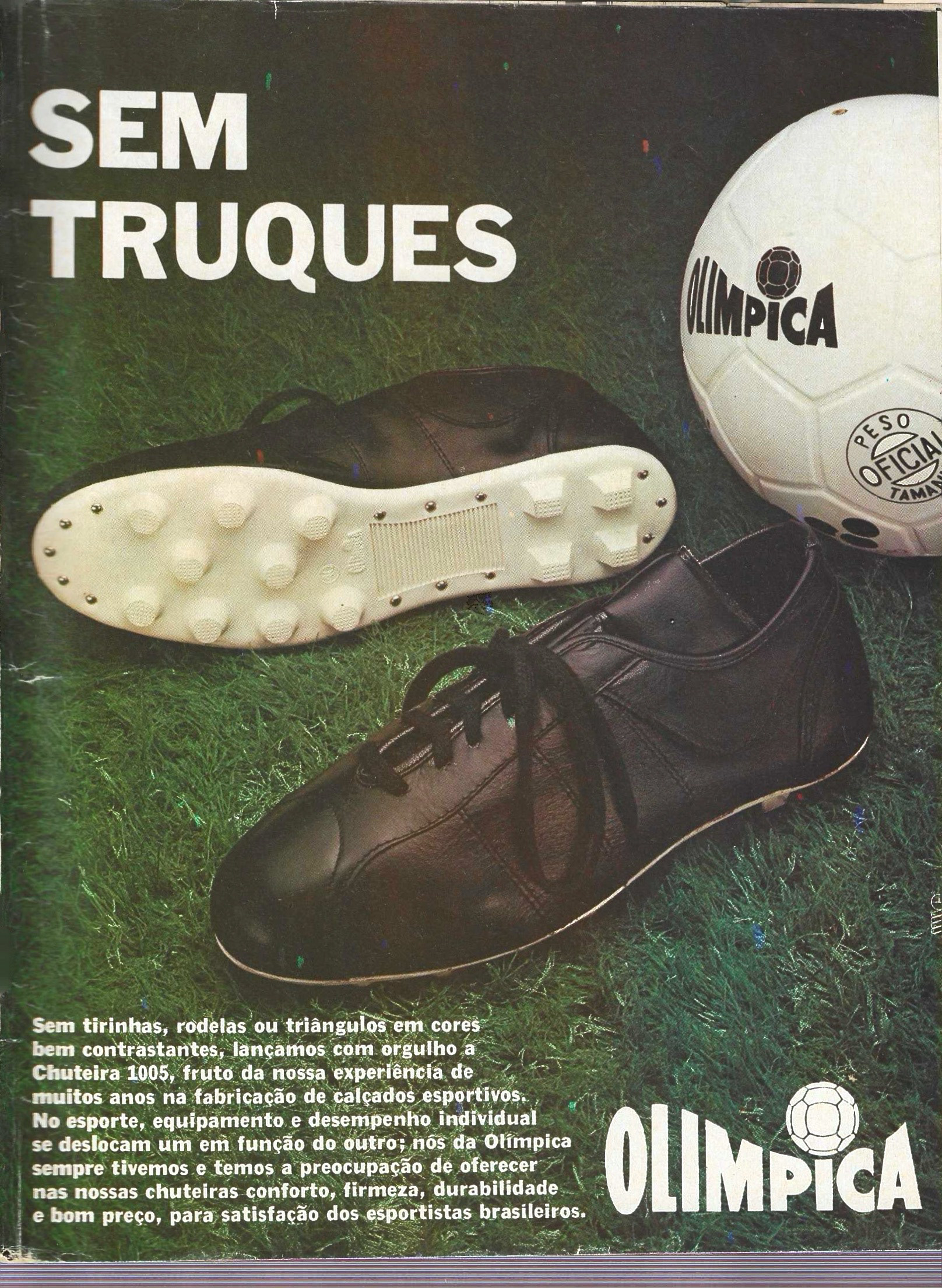 Publicidade de uma chuteira em 80, já dizendo sobre não ter “rodelas, tirinhas ou triângulos em cores”, por uma marca que, pessoalmente, não havia escutado até hoje.